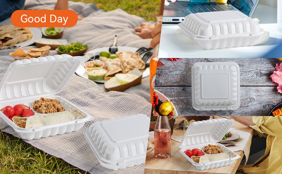 SIGURAN MATERIJAL - IZDRŽLJIV - MOŽE SE RECIKLIRATI - PP materijal bez BPA i siguran za hranu. Ove izdržljive spremnike možete koristiti koliko god puta želite. Ako ih ne želite ponovno upotrijebiti, možete jednostavno baciti ove spremnike u kantu za recikliranje ili smeće. Kontejner za van od mineralne plastike. Spremnici s 3 pretinca s poklopcem na šarkama
